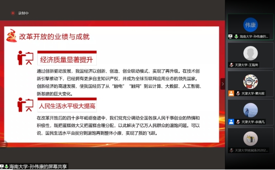 天津大学药学院辅导员王海英老师总结道,今天的四个主题犹如一朵花束,瓣瓣不同,却瓣瓣同心,四位同学的汇报都指向了我们共产党人的初心,准备充分,汇报深入,同学们积极参与互动研讨。通过这次的结队共建,联通了我们天之北、海之南的两所大学、两个学院、两个支部的思想、智慧和心声,也为我们日后的合作奠定了良好的基础,希望以此次活动为契机,两个支部能够互学互鉴,共同交流,加强联系。