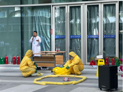 本次演练内容为模拟学生进行化学实验时不慎将管控类危险化学品溢洒的突发安全事件应急处置场景。事故发生后,实验室安全员、实验室负责人第一时间进行专业处理、实施自救,并启动应急响应、逐级上报,学校实验室安全指导小组在评判分析后第一时间启动实验室安全事故应急预案,安全保卫处做好现场警戒,专业应急救援小组对发生事故实验室开展应急处置。