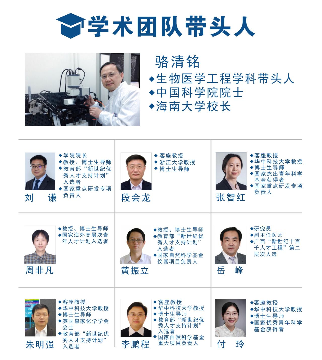 学院由骆清铭院士作为带头人,组建了优秀的学术团队。学院现有教授7人,客座教授5人,副教授2人,讲师5人。此外学院计划引育并举、组建一支高素质的人才队伍,专任教师规模为160人,其中学科带头人40人(含柔性引进人才10人),青年学者120人。学院拥有中国科学院院士、长江学者、杰出青年基金、教育部新世纪人才和青年千人等高层次人才。