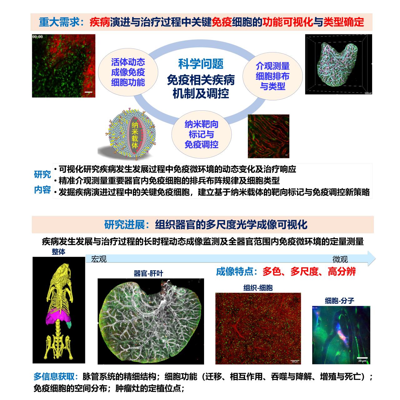 机体的免疫系统具有免疫防御、免疫自稳和免疫监督功能,人体90%以上的疾病与免疫失调有关。研究团队围绕“免疫相关疾病机制及调控”科学问题,针对疾病演进与治疗过程中关键免疫细胞的功能可视化与类型确定的重大需求,开展免疫成像与纳米诊疗研究。