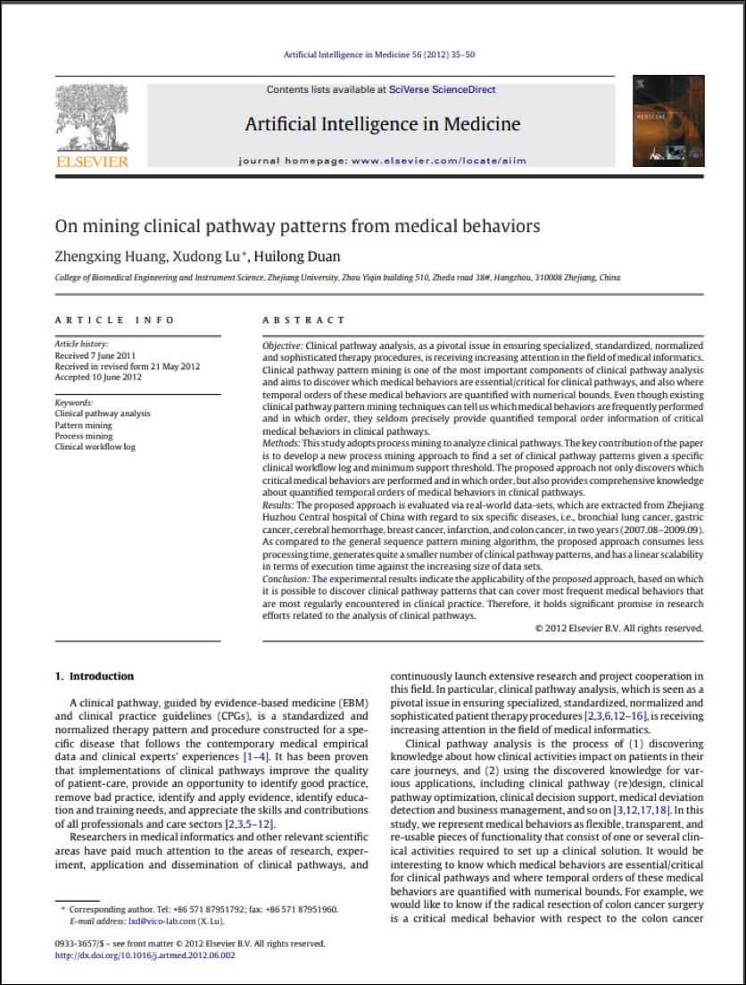 本方向以控制医疗差错,提高医疗安全水平为目标,研究基于过程挖掘技术的医疗违规行为检测方法,结合医疗大数据,发现违规行为和患者不良事件的关联。利用工作流技术和规则推理技术,研发符合医护人员使用习惯的医疗过程智能控制系统,应用于重症监护查房和冠脉介入术前等场合,实时预防并纠正医护人员的疏漏。