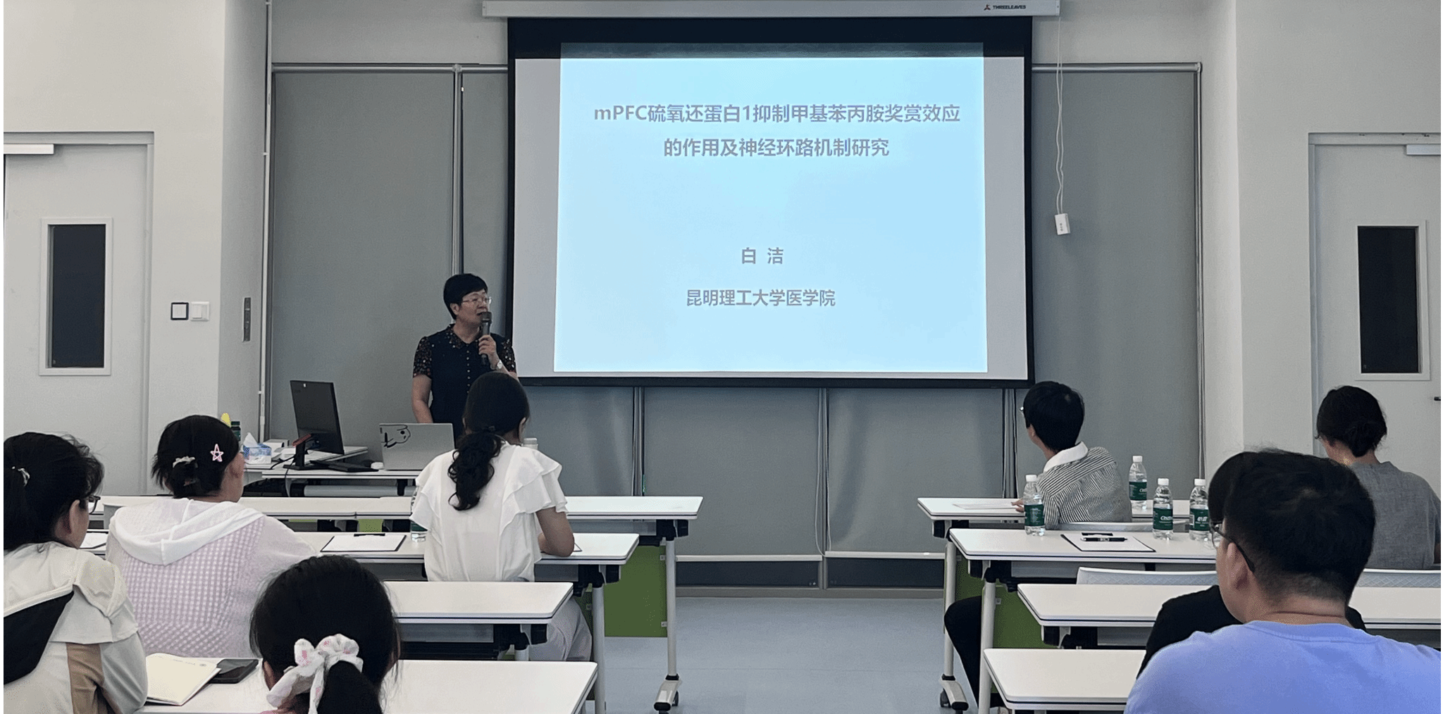 B302教室,昆明理工大学医学院白洁教授和华中科技大学生命科学与技术学院苏莉教授分别进行了主题为“mPFC(内侧前额叶皮层)硫氧还原蛋白1抑制甲基苯丙胺奖赏效应的作用及神经环路机制研究”和“高转移性三阴性乳腺癌转移驱动因子的发现”的精彩报告。