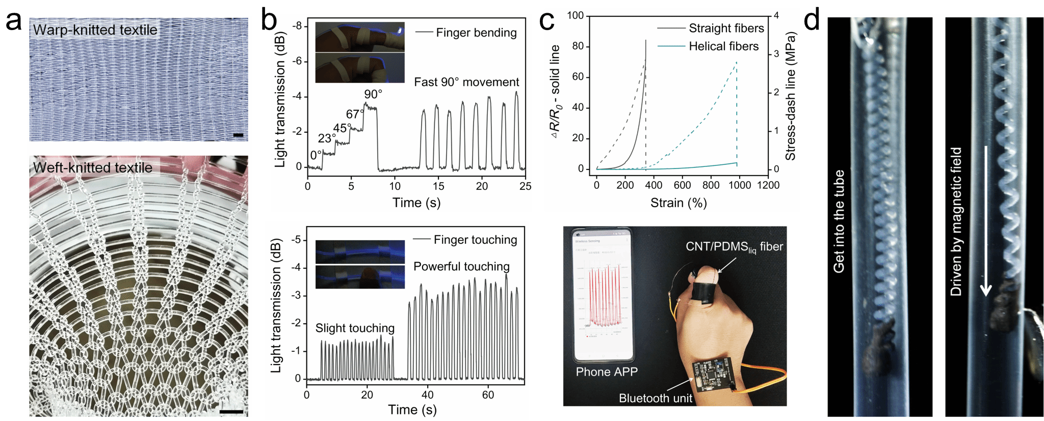 图3. (a) PDMS织物;(b) PDMS光纤的可穿戴力学传感应用;(c) 平直和螺旋结构CNT/PDMS纤维的力电性质及可穿戴力学传感应用;(d) 磁性修饰的PDMS螺旋纤维进入血管样管道并磁控移动。