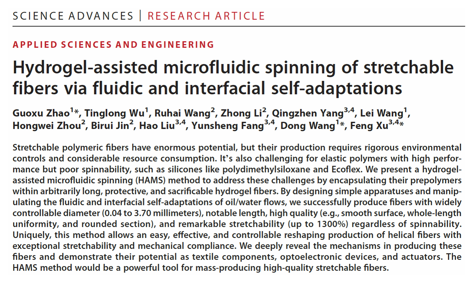 柔性电子材料与器件团队在国际期刊《Science Advances》(Science子刊,中科院一区Top期刊)发表题为“Hydrogel-Assisted Microfluidic Spinning of Stretchable Fibers via Fluidic and Interfacial Self-adaptations”的研究论文。