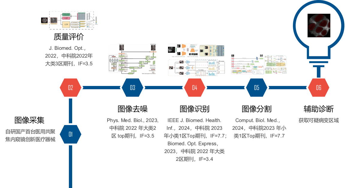 刘谦教授团队,在国家十三五重点研发计划项目的支持下,研制了国产首台医用共聚焦内窥镜创新医疗器械并转化。从 2020 年开始,在国家自然科学基金面上项目的支持下,该团队以消化道图像为研究对象,围绕以辅助医生提高诊断准确率为中心点,从共聚焦内窥镜成像方法、病理状态与医学图像特征关系的基本原理出发,研究图像质量评价、去噪、识别和分割等关键技术。近日,由博士生周经俊为第一作者,刘谦教授作为通讯作者,在IEEE Journal of Biomedical and Health Informatics,Computers in Biology and Medicine,Biomedical Optics Express,Physics in Medicine & Biology国际权威期刊发表系列文章,涉及图像去噪、图像识别以及高精度图像分割,旨在解决共聚焦内窥镜技术在临床应用中存在的主要挑战,提高医学图像的质量和诊断的准确性。