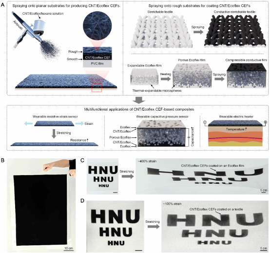 图1.CNT/Ecoflex CEFs的制备过程示意图及部分结果。