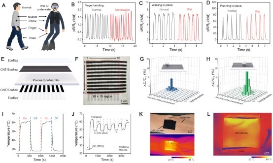 基于不同CNTs浓度的CNT/Ecoflex CEFs所具有的不同力学和电学性质,本工作成功研制出多种可穿戴电子器件,并展示了其生物医学应用潜力:基于1wt% CNTs浓度CEFs所具有的优异力-电响应灵敏度、工作范围和弹性,将其开发为能够监测手指、肘部、肌肉运动等人体力学信号的高灵敏度、大工作范围、耐用且防水的可穿戴应变传感器(图3A-D);基于具有高导电性的5wt% CNTs浓度CEFs,与具备优异可压缩性的热发泡Ecoflex薄膜相结合,开发出了用于人体压力信号强度和位置监测的多层式压力传感器(图3E-H),并利用其焦耳热效应开发出了用于人体温度管理的可穿戴电加热器(图3I-L)。