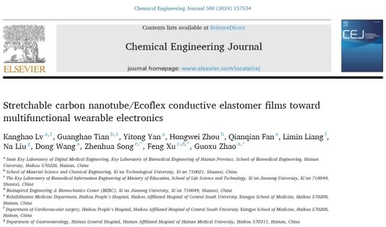 柔性电子材料与器件团队在国际高水平SCI期刊《Chemical Engineering Journal》(中科院一区TOP,IF=13.3)发表题为“Stretchable carbon nanotube/Ecoflex conductive elastomer films toward multifunctional wearable electronics”的研究论文。