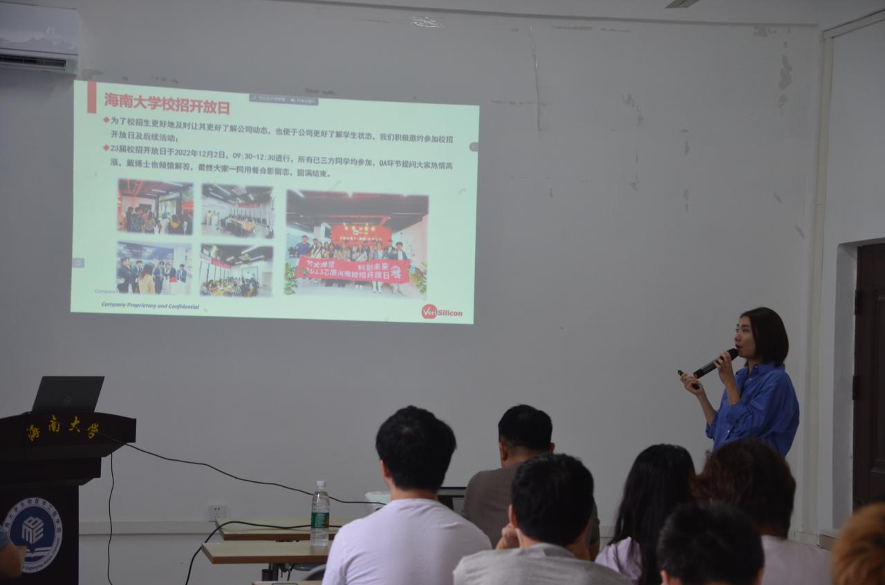 6月9日芯原微电子(海南)公司(以下简称芯原)受邀在学院314会议室举办了生产实习课程。2020级全体本科生参加课程,课程由芯原微电子(海南)公司人事部经理云玲主持,采取线上线下相结合的教学形式。